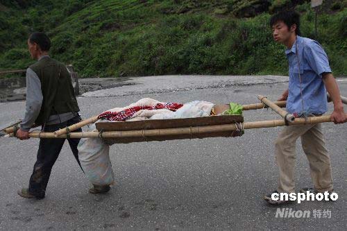 四川大地震,從都江堰到汶川縣映秀鎮(zhèn)沿線民房和交通受損嚴重,許多受困的居民紛紛離家趕往安全地點,也有許多居民想回家看往地震區(qū)的親人。圖為14日,友誼隧道附近的災民把受傷的孩子運往外面進行醫(yī)治。中新社發(fā) 黃榮 攝