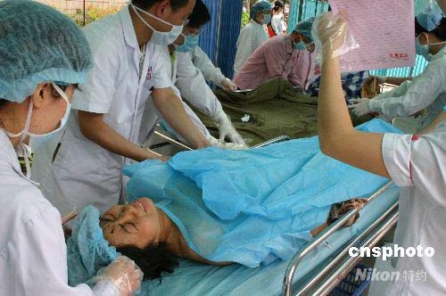 5月16日,成都華西醫(yī)院,來自汶川映秀鎮(zhèn)、什邡、綿竹等災(zāi)區(qū)的重癥傷員不斷轉(zhuǎn)運(yùn)而至,醫(yī)護(hù)人員和志愿者對(duì)重癥傷員進(jìn)行精心的醫(yī)護(hù)和救治。中新社發(fā) 楊杰 攝