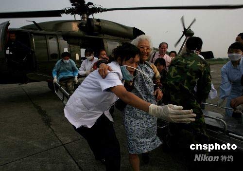 五月十六日下午,二十六名境外游客從汶川大地震被稱為“孤島”的茂縣登上救援的中國空軍黑鷹直升機,平安撤到四川省會成都。這批來九寨溝旅游的二十三位馬來西亞華人女性團隊中,歲數最大的游客已經九十歲。同機還有兩位巴西華人母女游客和一位加拿大男青年,她們被困在地震災區已經四天。中新社發 賈國榮 攝