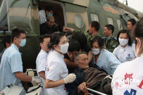 連日來,中國空軍連續出動軍用直升機到四川重災區緊急搶運危重傷員,及時送到成都進行救治,為挽救幸存者生命贏得時間。圖為5月15日,空軍航空兵某搜救團轉移傷員的情景。中新社發 譚超 攝