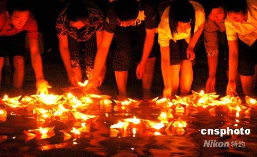 5月16日晚,安徽省蕪湖市辣子村36位四川籍員工將親手折疊的祈福船放入長江漂流,借燭光寄托思念,以漂船渡平安的表達(dá)方式,祈求家鄉(xiāng)受災(zāi)的親友戰(zhàn)勝災(zāi)魔。中新社發(fā) 陳立希 攝