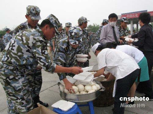 五月十六日十二點二十分許,一支從海南星夜兼程趕來的、有一千余名官兵組成的抗震救災隊伍到達成都成南高速路口加油站,早早等候在這里的成飛賓館工作人員,迅速為戰士們提供上盒飯、饅頭等飯菜。僅二十分鐘戰士們就用完飯菜,稍事休整后就出發趕往受災。中新社發 周丹鈺 攝