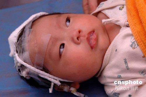 2008年5月17日下午,四川大學華西醫院抗震救災急診部門,接來一位出生剛80天,來自地震重災區四川綿竹的女嬰,她的名字叫廖靜萱。廖靜萱目前腦部出現腦水腫,可能將要進行腦部手術,其右腿也帶有地震創傷。中新社發 鄒憲 攝