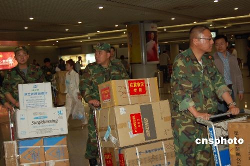 5月19日深夜,部隊官兵攜帶救援藥品到達四川成都雙流國際機場,為救治四川汶川大地震受傷人員添力。