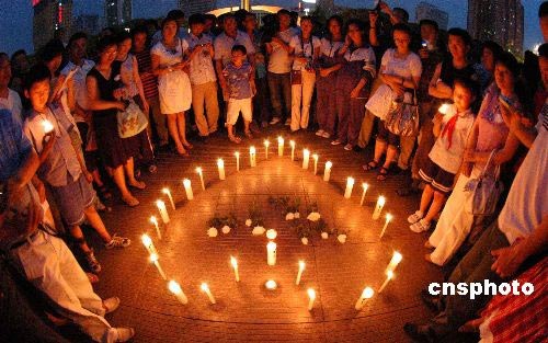 5月19日晚,新疆巴音郭楞蒙古自治州(簡稱巴州)團委在新疆庫爾勒市人民廣場舉辦共青團員“點燃蠟燭、寄托對汶川大地震遇難同胞的哀思”活動,為汶川地震遇難同胞默哀。中新社發 確·胡熱 攝