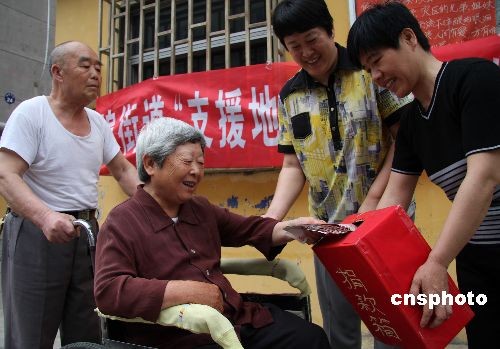5月27日,退休老人張世俊(左一)推著老伴來到捐款站,把節(jié)儉下來的5000元錢投進(jìn)捐款箱。這是老夫妻倆第三次為地震災(zāi)區(qū)捐款獻(xiàn)愛心。汶川大地震發(fā)生后,張世俊、李愛玲夫婦先后三次把省吃儉用的2萬元錢捐給地震災(zāi)區(qū),在當(dāng)?shù)乇粋鳛榧言挕V行律绨l(fā) 吉 喆 攝