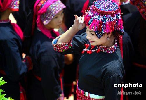 一位海南五指山苗族姑娘,5月下旬在村寨向游人展示民族服飾,宣傳民族文化。當地政府正在挖掘少數民族傳統文化、利用原生態的自然環境條件,發展旅游業,振興家鄉經濟。中新社發 宋吉河 攝