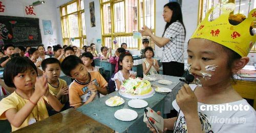 5月28日,重慶市永川區(qū)萱花小學三.三班全體同學為來自四川省江油災區(qū)的段明陽過了個簡單而隆重的生日,同學們分批次地把自己親手做的生日禮物送給段明陽,并祝她生日快樂。段明陽向全班同學清唱了一首《裝扮藍色的地球》表謝意,并一一把生日蛋糕喂給同學們,期望能盡早地融入到新的集體里。中新社發(fā) 陳仕川 攝