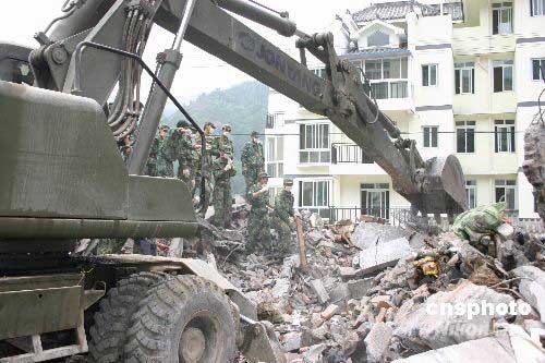 圖:解放軍在四川彭州清理地震廢墟