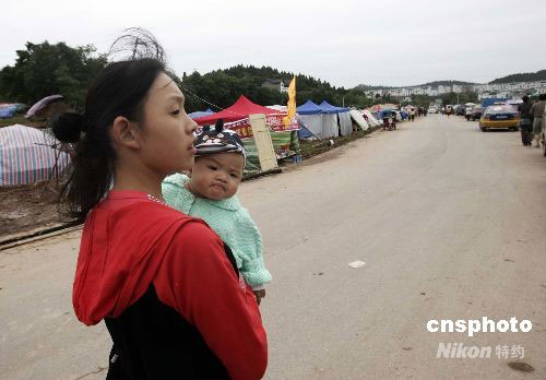 5月29日,受唐家山堰塞湖潰壩險情影響,綿陽市游仙區沈家壩東街社區居民陸續撤離至富樂山高地,一位年輕的媽媽抱著孩子來到這里準備開始避險生活。中新社發 杜洋 攝