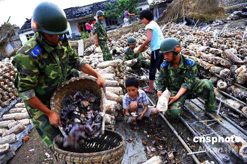 六月三日,空降兵士兵在四川什邡幫助百姓搶收木耳。四川什邡是重要的木耳生產(chǎn)基地,地震中損失慘重。五月十二日發(fā)生地震后八小時即空降至該地的空降兵部隊,目前正開展幫助民眾重建家園工作,兩天內(nèi)他們已幫助農(nóng)民搶收木耳九千多公斤,以盡力減少地震帶來的經(jīng)濟損失。中新社發(fā) 慎重 攝