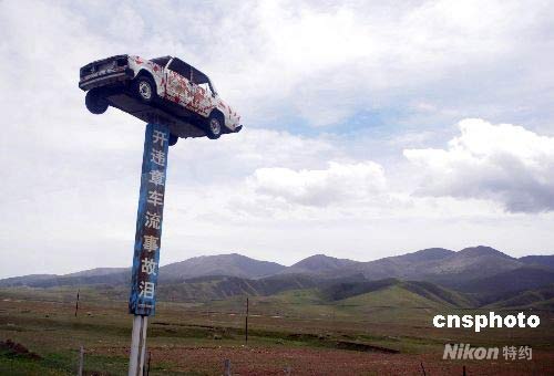 6月23日,青海省青海湖交通管理部門將事故真車架在寫有交通警示語的柱子上,警示交通安全。中新社發 廖攀 攝