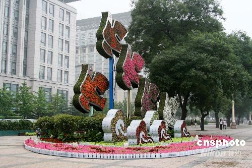 2008年6月30日,奧運鳥花壇亮相北京西單。這個花壇由5只鳥形的小花壇組成,每只鳥的顏色各異,高度也不同,高高矗立,甚是美觀。 中新社發 任丘 攝