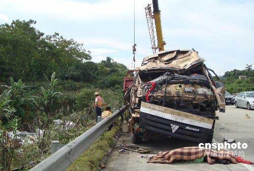 7月2日7時(shí)30分,GO5O國道廣西都南高速公路距離武鳴服務(wù)區(qū)五公里處,發(fā)生一起交通事故,造成一死一傷。一輛車牌號(hào)為川J22030的大貨車由都安開往南寧方向,在廣西都南高速公路距離武鳴服務(wù)區(qū)五公里處撞至公路護(hù)欄后沖出路外,翻下護(hù)坡,造成一人當(dāng)場死亡。中新社發(fā) 黃艷梅 攝