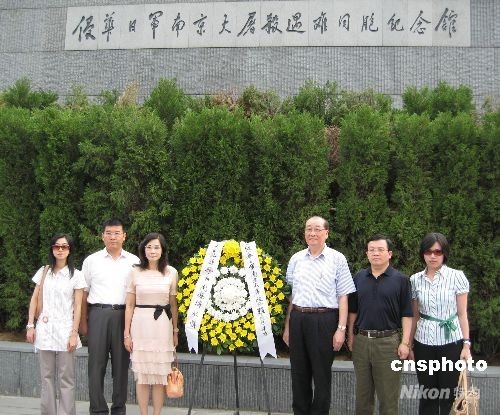 七月二十七日下午,臺北縣南京參訪團(tuán)在侵華日軍南京大屠殺三十萬遇難同胞紀(jì)念館,為三十萬遇難同胞默哀、敬獻(xiàn)花圈。參訪團(tuán)原由臺北縣長周錫瑋率領(lǐng),但周錫瑋因需返島內(nèi)處理緊急事務(wù),在簽署完南京市與臺北縣經(jīng)貿(mào)文化合作備忘錄后便離寧,參訪團(tuán)其他成員則繼續(xù)行程。中新社發(fā) 唐娟 攝