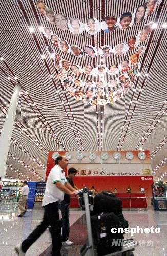 8月26日,北京首都機場三號航站樓內(nèi)“笑臉”懸掛,缶樂齊鳴,一片歡樂的海洋,歡送奧運大家庭成員回國。 中新社發(fā) 吳芒子 攝