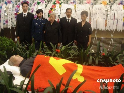 8月31日上午,原中共中央主席華國鋒遺體告別儀式在北京八寶山革命公墓舉行。華國鋒因病醫治無效,于8月20日12時50分在北京逝世,享年87歲。圖為華國鋒夫人韓芝俊(中)率子女在告別儀式上。中新社發 韓凱 攝