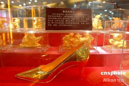 9月3日,在遼寧沈陽(yáng)一黃金商店的柜臺(tái)內(nèi),一只一公斤重的純金高跟鞋吸引了很多顧客的目光。這只金鞋使用999千足金打造,5名技師歷經(jīng)48個(gè)工作日才完成。中新社發(fā) 孫海 攝