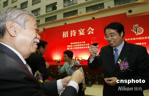 九月八日晚,國務院僑辦在廈門設宴款待出席“2008海外華商中國投資推介會”高端訪談及“改革開放三十年僑資企業成就展”的嘉賓,國務院僑辦、福建省僑辦及廈門市僑辦領導上臺感謝僑商僑資為祖國經濟建設付出的努力。中新社發 王麗南 攝