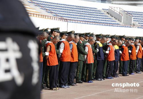 9月18日中午11時(shí),新疆伊犁州公、檢、法等部門在伊寧市體育場(chǎng)舉行公捕公判大會(huì)。公判大會(huì)上,新疆自治區(qū)高級(jí)人民法院伊犁州分院對(duì)買買提艾力.阿不都熱合曼等12名犯罪分子進(jìn)行公開宣判,對(duì)艾力.庫(kù)那洪等12名危害國(guó)家安全及嚴(yán)重?cái)_亂社會(huì)秩序的犯罪嫌疑人公開執(zhí)行逮捕。中新社發(fā) 李志剛 攝