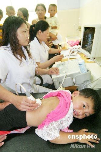 9月22日,自三鹿嬰幼兒奶粉等一批含有三聚氰胺的問題嬰幼兒奶粉暴光后,江蘇省贛榆縣迅速啟動小兒腎結石診療綠色通道,各大醫院開辟從咨詢、診斷、檢查到住院等各個環節的專門場所,確!敖Y石寶寶”得到及時有效的救治。 中新社發 司偉 攝