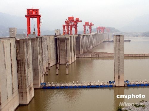 9月27日下午,據中國長江三峽工程總公司消息,經國務院批準,三峽工程從9月28日零點起試驗性蓄水,三峽壩前水位由145米水位開始抬升,至10月6日左右攀高至156米,再根據實際蓄水情況經國務院審批看是否進一步提高水位至175米。中新社發 劉君鳳 攝