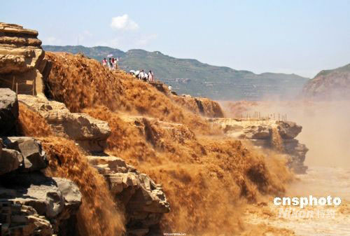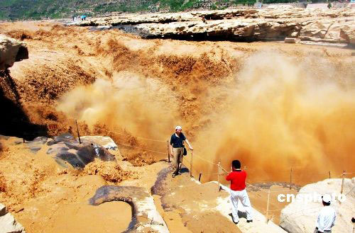 2008年10月1日,游人在黃河壺口處游覽,拍照留念。位于陜西宜川縣和山西吉縣交界處的黃河壺口瀑布,有“天下黃河一壺收”之譽,主瀑布寬約40米左右,落差40米以上,今年上游來水量增加,壺口瀑布流量隨之增加,“十一”黃金周吸引了眾多游客。中新社發 沙漠 攝