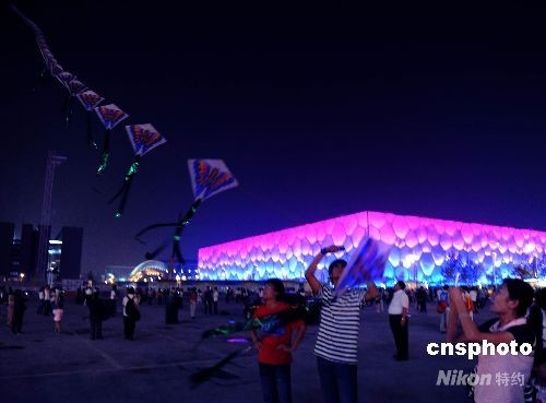 北京市民在十一國慶長假夜晚,在北京奧運會主游泳館國家游泳中心“水立方”外放飛風箏。中新社發(fā) 賈國榮 攝