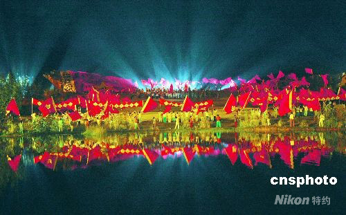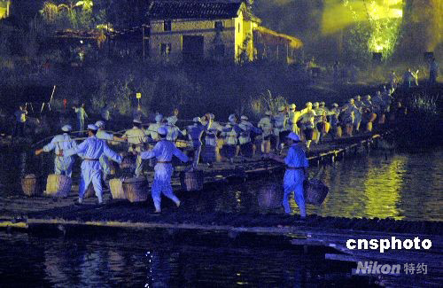 十月六日晚八時(shí),江西省首個(gè)大型戶(hù)外實(shí)景演出《井岡山》,再現(xiàn)當(dāng)年八十年前紅軍挑糧上井岡山情景。這場(chǎng)《井岡山》的演出由近千名當(dāng)?shù)剞r(nóng)民參演,采用一千多盞燈光、五萬(wàn)五千多平方米的舞臺(tái)。中新社發(fā) 段長(zhǎng)征 攝