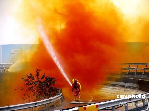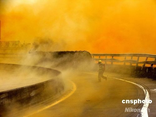 10月7日10時11分,位于杭甬高速公路寧波段塘出口處,一裝載29噸硝酸的槽罐車在自西向東行駛過程中,撞擊護欄后側(cè)翻,發(fā)生泄露事故。中新社發(fā) 何蔣勇 攝
