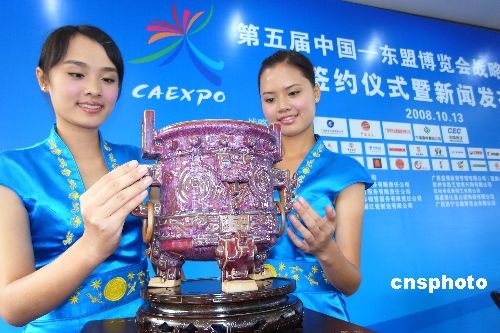10月13日,由河南禹州孔家鈞窯燒制的2008中國—東盟博覽會鈞瓷國禮《象天鼎》運抵廣西南寧,作品由中國工藝美術大師孔相卿設計,以中國古老的青銅禮器“鼎”為基本造型設計制作,表達了中國與東盟國家互利合作、共享繁榮的美好愿望。據悉,第五屆中國—東盟博覽會將于10月22日—25日在中國廣西南寧舉行,《象天鼎》將作為國禮,贈送給參加博覽會的各國政要。中新社發 牛書培 攝