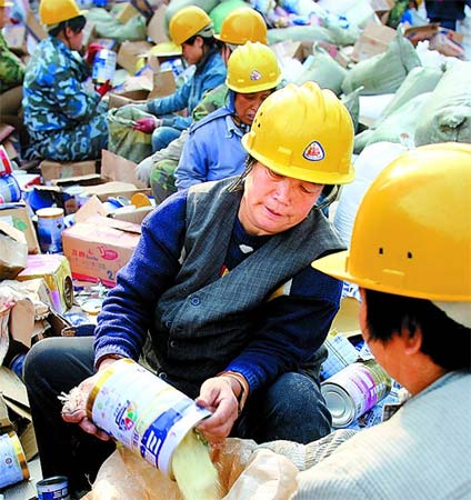 圖為工人將問題奶粉分揀裝袋以便銷毀。《河北日報》記者 馬建敏、趙永輝攝影報道