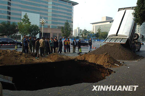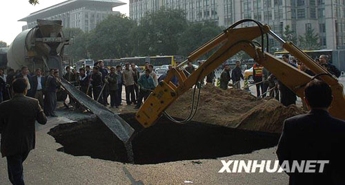 10月17日,北京西長安街西單文化廣場附近路面發生塌陷,目前有關部門正在積極進行搶修。新華社記者公磊攝