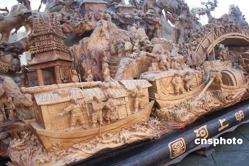 10月21日,長(zhǎng)18米的巨型根雕《清明上河圖》在開封東京藝術(shù)中心廣場(chǎng)展出。據(jù)工作人員介紹,這一作品原木是一株生長(zhǎng)在東南亞熱帶崇山峻嶺中的香樟古木,樹齡在2300年以上,樹高百米,樹干直徑4米,根徑20米,完全暴露風(fēng)干近10年。后以北宋畫家張擇端的《清明上河圖》為藍(lán)本,由福建35位藝術(shù)家和工匠歷時(shí)5年精雕細(xì)刻而成。雕刻完成后,作品長(zhǎng)18米,高2.56米,寬2米,重12噸。 據(jù)悉,這一來自福建莆田的巨型香樟木根雕《清明上河圖》作品,已經(jīng)申報(bào)吉尼斯世界紀(jì)錄。中新社發(fā) 劉書亭 攝