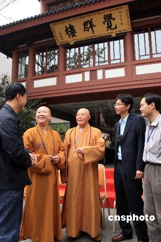 10月22日,高校佛學專家們與上海玉佛寺方丈覺醒法師(左二)、真如寺妙靈長老(中)參加“佛教與生態(tài)文明”學術(shù)研討會。當日,“佛教與生態(tài)文明”學術(shù)研討會在上海佛門圣地玉佛寺召開,中國高等院校著名學者、佛教界法師、居士數(shù)百人參會。中新社發(fā) 潘索菲 攝