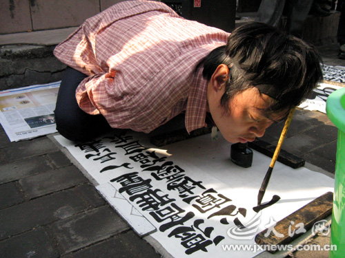 “真厲害!用手寫出這么好的毛筆字都難,何況是用頭寫。”28日上午,許多市民在南昌八一大橋下圍觀一名用頭寫字的乞討者,市民贊賞之余不斷將錢投入乞討者的塑料桶里,甚至有市民花高價(jià)購買乞討者的書法。