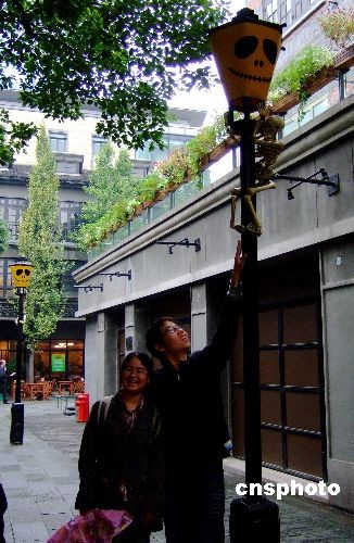 2008年10月29日,為迎接2008萬圣節,上海新天地酒吧街已完成全程置景的設計布置,以綿延酒吧街數十處的萬圣置景,為游客“講述不怕鬼的故事”。南瓜頭鬼,白骨嶙峋鬼,美女鬼,小丑鬼……在路邊、酒桌上、樹頂、草地里、燈桿上、石庫門陽臺間,夸張得有趣,吸引游人目光。中新社發 蔣振雄 攝