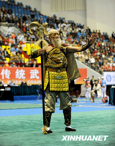 10月31日,88歲的劉子均在表演奇門兵器——羊角骶。當日,正在湖北省十堰市舉行的第三屆世界傳統武術節開始武術比賽。來自中國武術協會代表隊88歲的劉子均習武70多年,他在比賽中表演的羊角骶藝驚四座。新華社記者余國慶攝