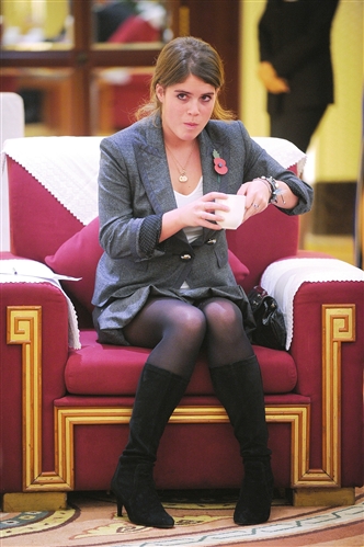 引人矚目的是,隨同安德魯王子 一同出訪的還有他的二女兒——尤金妮亞公主。由于這是第一次出國訪問,也是第一次以英國王室成員的身份亮相公眾,年輕的尤金妮亞公主很注意形象:特意穿了一身深灰色的職業(yè)套裝,黑色絲襪,黑色高跟鞋,隨身攜帶黑色手提包,舉止十分端莊,七分袖和喇叭裙擺的設(shè)計(jì)凸顯了公主的活潑美麗。在媒體鏡頭前,今年剛滿18歲的尤金妮亞公主顯得稍微有些局促,不時(shí)露出靦腆的笑臉。細(xì)品川茶時(shí),輕輕抿一口,一不小心灑些茶水出來,她還飛快看一眼鏡頭,偷偷一笑,很是俏皮可愛。