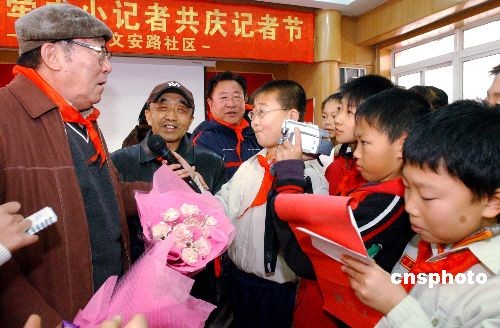 11月7日,沈陽市新聞工作者協會的十余名沈陽人民廣播電臺的離退休新聞工作者與文安路社區的小記者舉辦了“老記者牽手小記者共慶記者節”活動,老新聞工作者勉勵小記者用鏡頭和紙筆,去捕捉家鄉的新人新事新面貌,共敘祖國的繁榮富強,以此來迎接11月8日中國第九個記者節。中新社發 羅瀾 攝