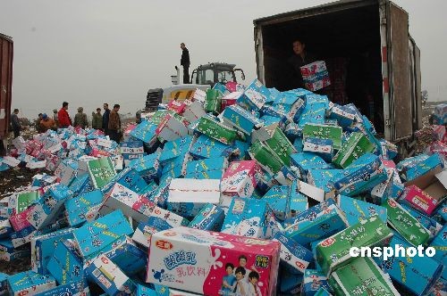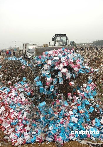 11月17日,河南南陽(yáng)市臥龍區(qū)在生活垃圾處理場(chǎng)集中銷毀“三鹿”問題液態(tài)奶。當(dāng)日,該區(qū)共銷毀從經(jīng)銷商回收和工商機(jī)關(guān)監(jiān)督統(tǒng)一下架、集中扣押、封存和消費(fèi)者退回的問題“三鹿”純牛奶、酸奶、早餐奶等液態(tài)奶16噸,在生活垃圾場(chǎng)采取碾壓、深埋,進(jìn)行無害化處理。中新社發(fā) 熊運(yùn)彬 攝