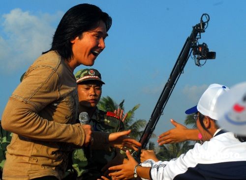 11月16日,著名歌星費翔在第九屆中國海南島歡樂節開幕式上激情演唱《故鄉的云》。費翔說,他第一次演唱該歌時是1987年,1988年他到過文昌,20年來海南島發生巨大變化,但僑鄉文昌明媚的陽光、潔白的沙灘和文昌人民的熱情沒有變。中新社發 善平 攝