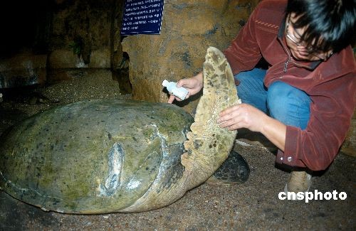 11月22日,綠海龜靜靜趴在溫度適宜的暫養(yǎng)池里,水族館技術(shù)人員用藥為它治療傷口。日前,江蘇連云港市連島水族館收治了一只巨型綠海龜,經(jīng)過(guò)幾日精心救治,這位超過(guò)100歲的老壽星會(huì)慢慢地將頭抬起來(lái)。據(jù)介紹,這只海龜長(zhǎng)約160厘米,寬約100厘米,頭部、右前方和左后方龜蓋上有明顯傷痕,可能是在海水里被螺旋槳?jiǎng)潅模焓钟|摸可以摸到肉,在剛接來(lái)時(shí)右后腿還在流血,眼睛也受感染。水族館收治后,派三位專人悉心照料,待傷情恢復(fù)后再放歸大海。這只巨型綠海龜是贛榆縣宋莊鎮(zhèn)漁民在收網(wǎng)時(shí)無(wú)意中捉到的。中新社發(fā) 王春 攝