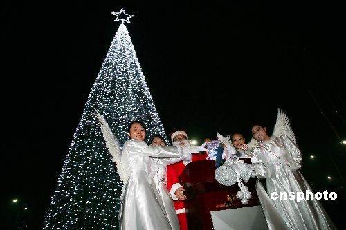 11月24日晚,在山東濰坊市區(qū)一家酒店門前,一棵10米高的巨型圣誕樹吸引了眾人的目光。中新社發(fā) 張馳 攝