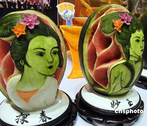 2008年11月27日,上海餐博會中展出用西瓜雕刻而成的《紅樓夢》人物臉譜。中新社發 井韋 攝