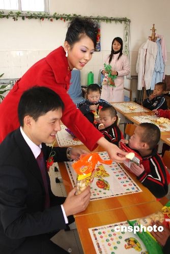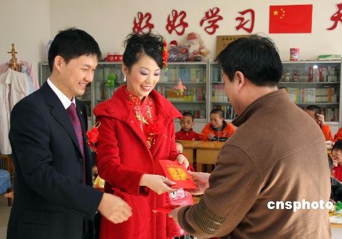 11月29日,身在廣東公安系統工作的梁智、王文星兩位新婚警察夫婦在河北滄州老家舉辦婚禮,他們決定把親友送的婚禮紅包禮金15888元分別捐獻給四川地震災區和滄州市福利保障院的智障兒童。結婚典禮結束后,這對新婚夫婦驅車前往福利院看望兒童,并向當地民政部門捐獻了自己的結婚紅包禮金。中新社發 楊志濤 攝