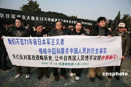 13日上午10時,凄厲的警報在南京城上空拉響,江蘇省暨南京市各界代表以及海內外和平友好人士近5000人在侵華日軍南京大屠殺遇難同胞紀念館舉行集會,悼念南京大屠殺30萬同胞遇難71周年,日本和平友好人士應邀參加。中新社發 鐘山 攝