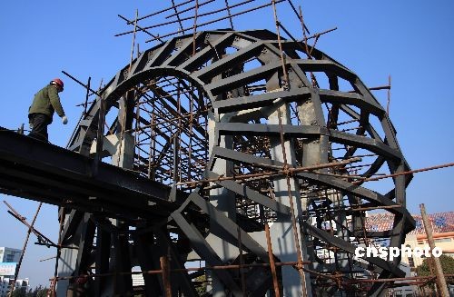 2008年12月14日,江蘇省淮安市南北地理分界線(xiàn)標(biāo)志工程中的主體標(biāo)志球已經(jīng)成形,人行通道欄桿也已安裝,工人們正在全力施工,力爭(zhēng)年底前工程竣工。中新社發(fā) 徐洪云 攝