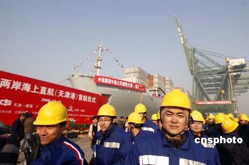 12月15日,海峽兩岸海上直航首航儀式在天津市天津港舉行。據悉,當日舉行首航儀式的,大陸有天津、上海、太倉、福州、廈門、泉州6個港口,臺灣有基隆、高雄2個港口,參加首航的船公司13家,其中大陸9家公司15艘船舶,臺灣4家公司5艘船舶。中新社發 盛佳鵬 攝