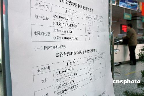 12月15日,海峽兩岸全面直接通郵正式開通,目前,各項準備工作也已經就緒。當日起,兩岸將通過空運或海運直航方式將郵件總包送至對方郵件處理中心,這標志著兩岸全面、直接、雙向通郵正式實施。屆時,中國郵政集團公司將全面開辦兩岸郵政業務和郵政匯兌業務,大陸6萬多個郵政網點原則上也將同步開展兩岸函件、包裹、特快專遞及郵政匯兌業務。中新社發 鄭雄增 攝